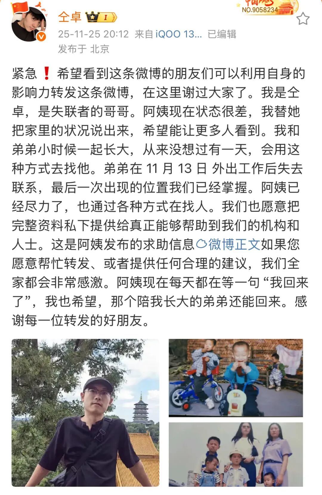 11月25日,演员仝卓发布一条求助信息,称与其一起长大的表弟在11月13日外出工作后失去联系,其家人在通过各种方式在找人,并附带了弟弟母亲发布的详细求助信息。
