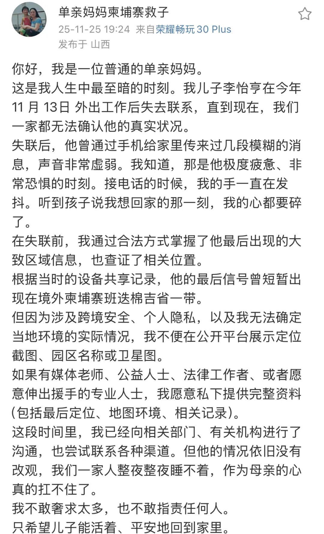 据@单亲妈妈柬埔寨救子 发布的信息显示,其儿子李怡亨最后信号曾短暂出现在境外柬埔寨班迭棉吉省一带,“失联后,他曾通过手机给家里传来过几段模糊的消息,声音非常虚弱。”“直到现在,我们一家都无法确认他的真实状况。”