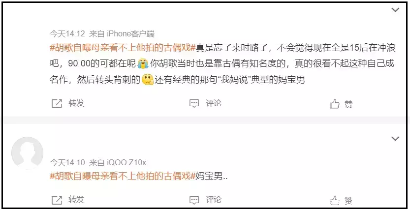 果不其然,胡歌和他妈妈都被吐槽了,有网友觉得胡歌43岁了还把妈妈挂嘴边,好一个妈宝男;有网友觉得胡歌就是靠古偶火的,却因为妈妈的话否定来时路,不愧是妈宝男。