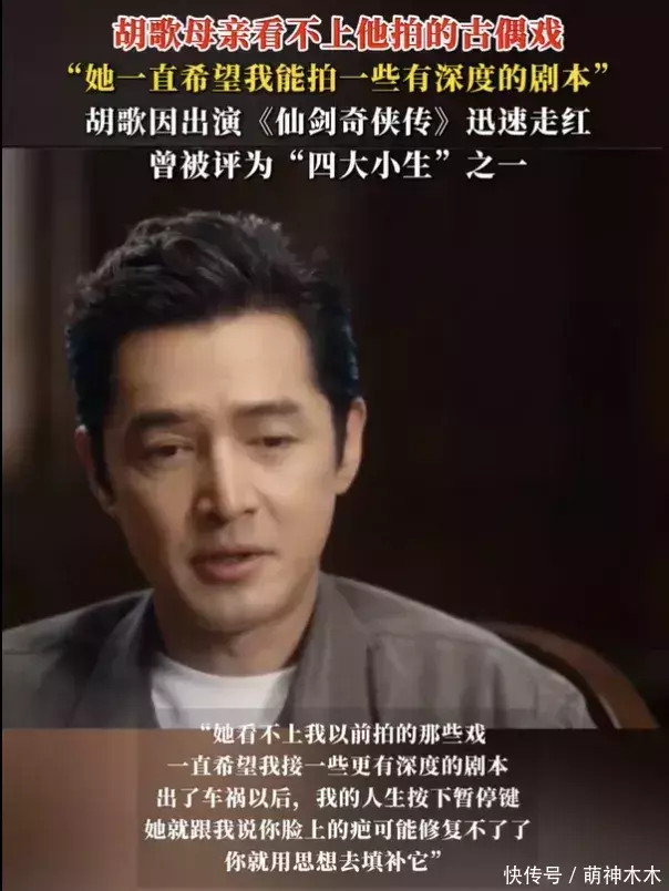 2006年,24岁的胡歌遭遇车祸,脸部受伤严重,一度认为无法再做演员,复出之后处于事业迷茫期,就像明星一到三四十岁就有人催他们转型一样,胡歌妈妈并非看不上古偶戏,而是从儿子实际情况出发,知道胡歌不能一辈子靠脸吃饭,才会提醒他需要接更多有深度的戏。