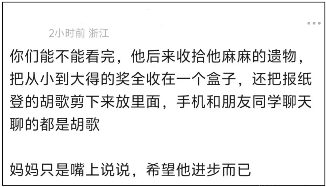 还有网友指出,不管胡歌本意如何,他在采访中把自己的事业选择和妈妈联系到一起,很容易让已经去世了的妈妈挨骂,而网友的担心不无道理。